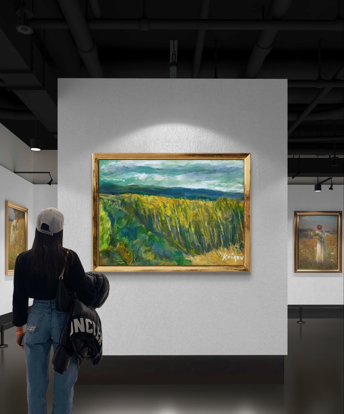 Cette peinture évoque un champ de blé ondoyant sous un ciel orageux, avec en arrière-plan la chaîne du Jura.