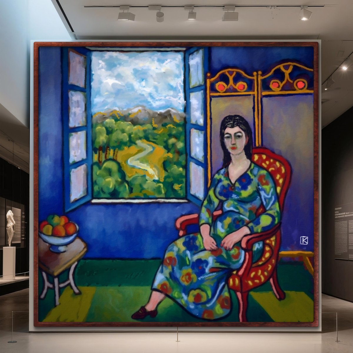 Par la fenêtre ouverte, un chemin s’inscrit dans la verdure, ruban lumineux qui serpente vers l’inconnu. La femme ne dit rien : elle écoute en elle-même la même rivière, celle qui avance, paisible, sans retour.