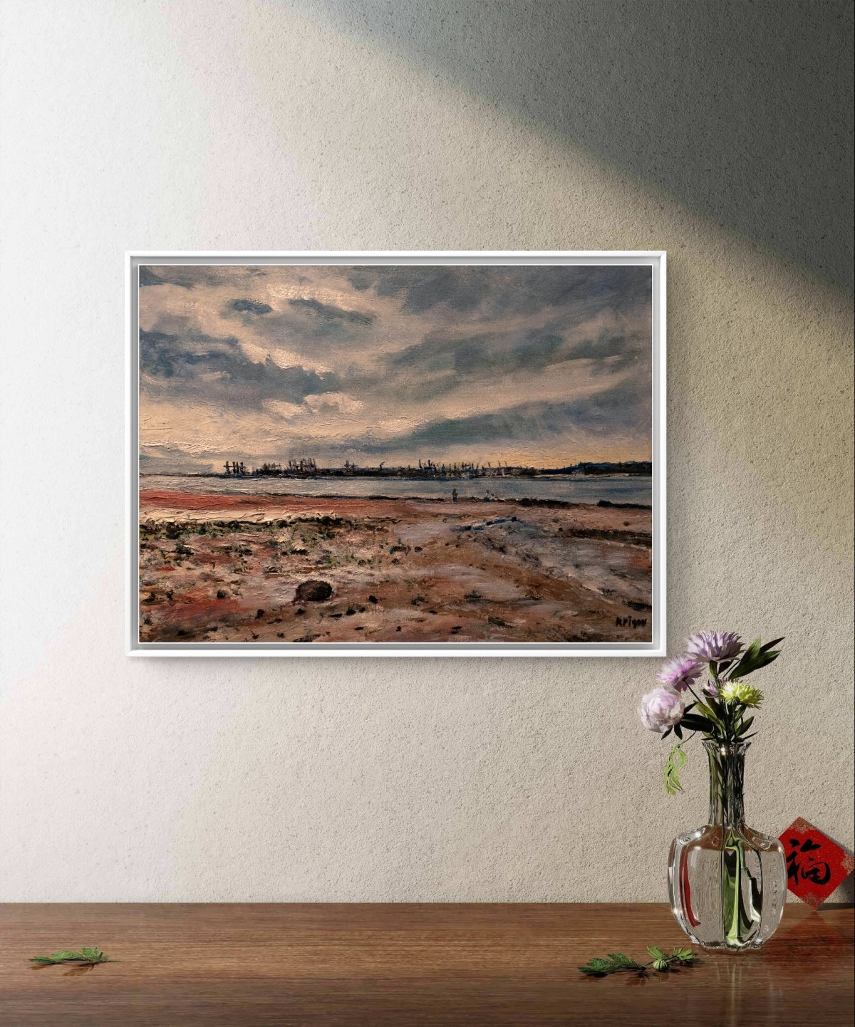 La terre ocre et humide garde les traces de la marée — un mélange de sel, d’argile et de mémoire.Loin, sur la ligne tremblée de l’horizon, les silhouettes des grues se dressent comme des mâts immobiles, vestiges d’un port qui attend encore le retour des marins.
