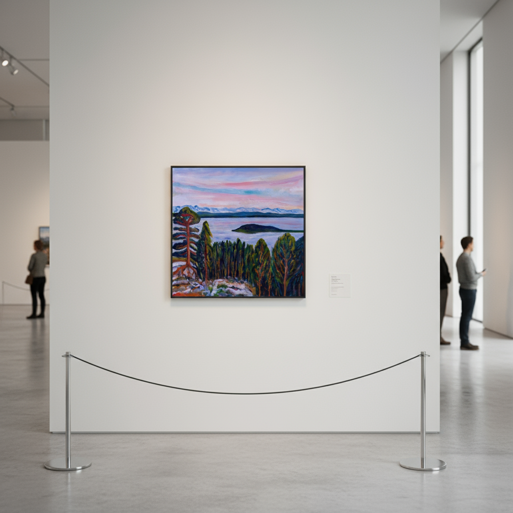 Les pins dressent leurs silhouettes, vigiles sombres au bord du monde. Le ciel s’ouvre en nappes de soie, rosées de crépuscule, et les montagnes bleues s’effacent lentement dans l’horizon glacé.