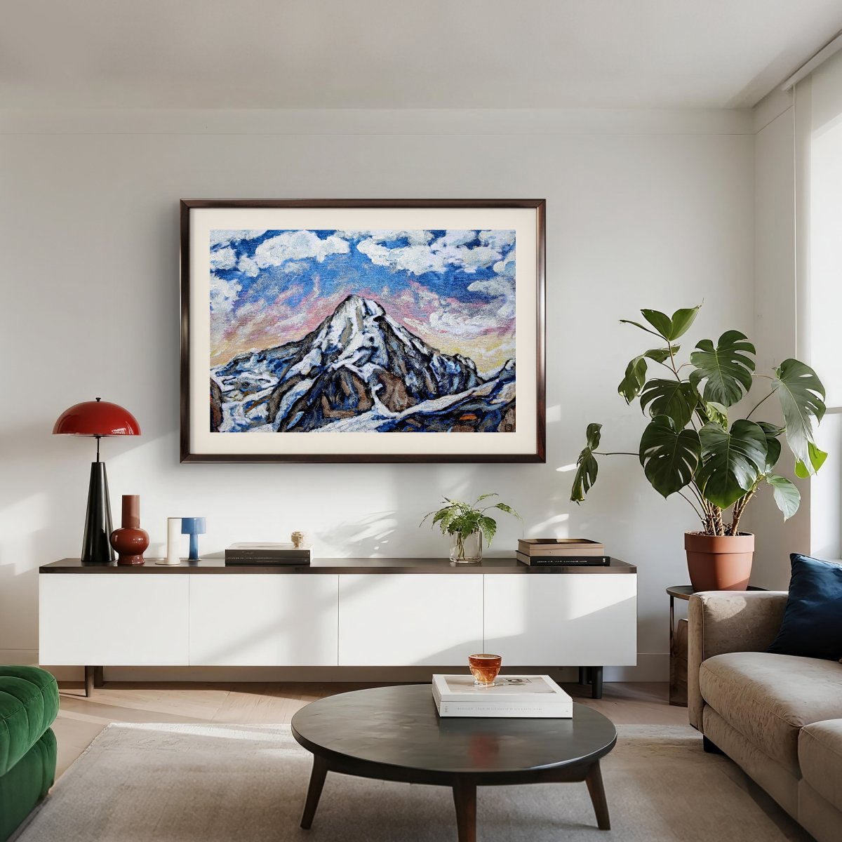 La peinture s’élève comme un hymne à la verticalité, un souffle de grandeur pris dans l’éclat glacé de la montagne.