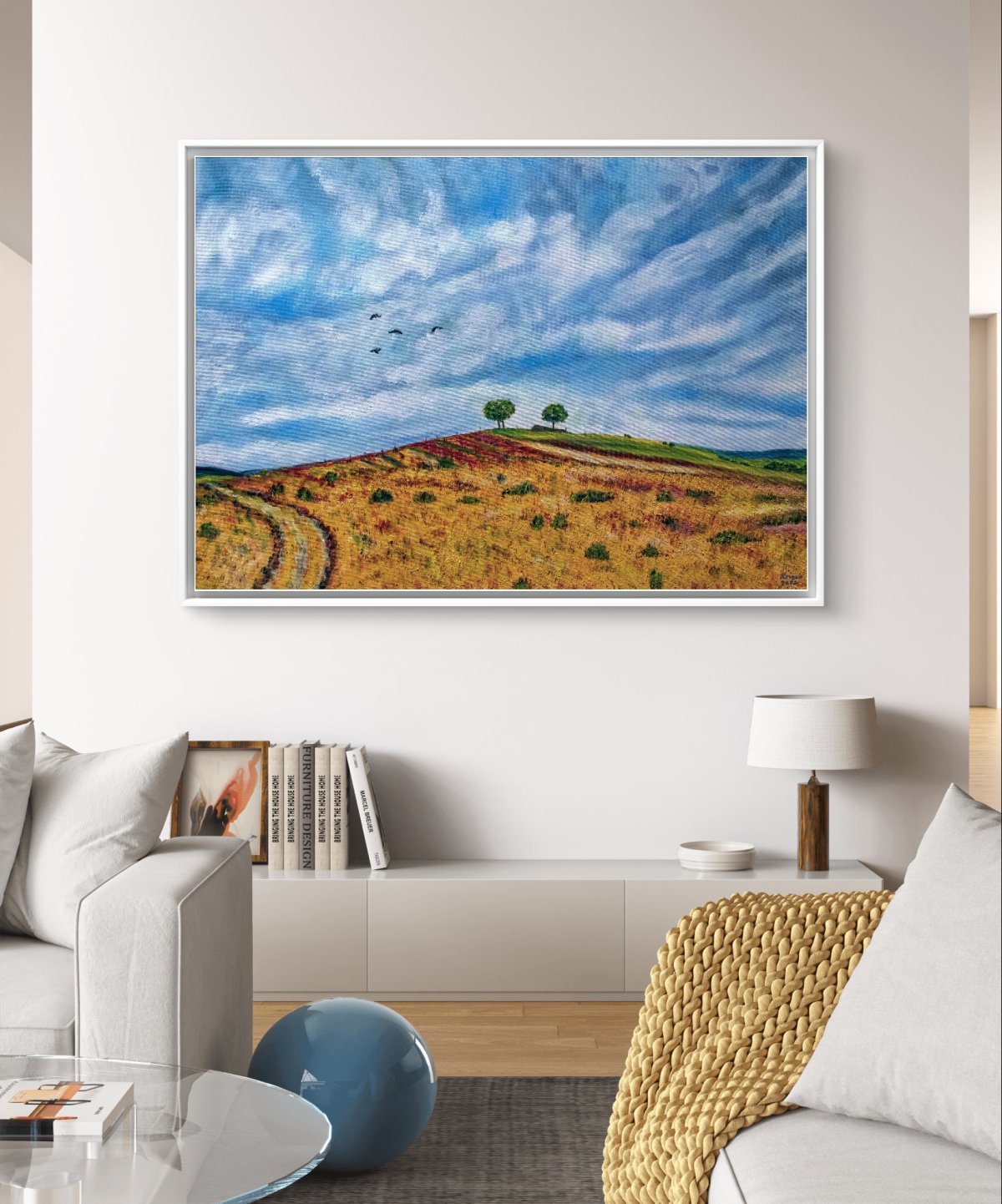 La colline respire, couverte d’herbes blondes et de sillons rouges, sous un ciel immense où glissent des nuages d’argent.Trois arbres, veilleurs tranquilles, se dressent au sommet — compagnons du vent, gardiens d’un silence rural.Tout ici parle d’équilibre et de solitude, d’un monde où la simplicité devient splendeur.Les oiseaux, légers messagers du lointain, traversent le ciel en oblique, rappelant que tout est passage, tout est souffle.