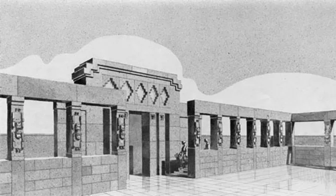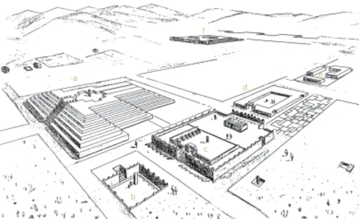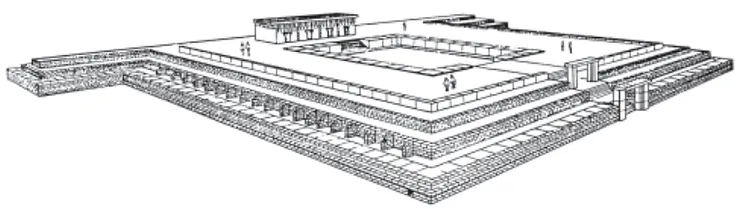 Une grande cour centrale, 38 x 63 mètres, sans toit, délimitée dans ses angles par quatre piliers, peints en rouge et bas-relief cruciforme, représentant peut-être la quadripartition du territoire, composait l'ensemble.