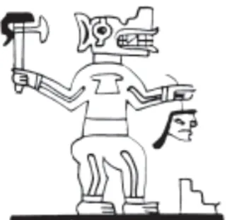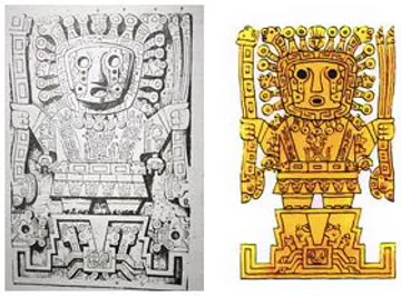 Par exemple, le dessin surmontant le trône (image ci-dessus) a été recopié à partir d'une figure représentant Viracocha, ornant la porte du Soleil à Tiwanaku. Pour certains, ce dieu central s'appellerait Tunupa, la divinité cosmique des Aymaras, souvent confondue avec Viracocha, sa variante chez les Incas. (Explications dans le paragraphe "La porte du soleil de Tiwanaku".)