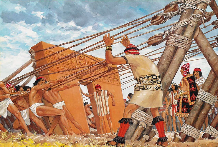 Les archéologues émettent l’hypothèse que pour déplacer des blocs de plusieurs tonnes, ils ont été mis sur un remblai recouvert d'argile mouillée et traînés sur une distance de dix kilomètres, à l’aide d'épaisses cordes torsadées de cuir.