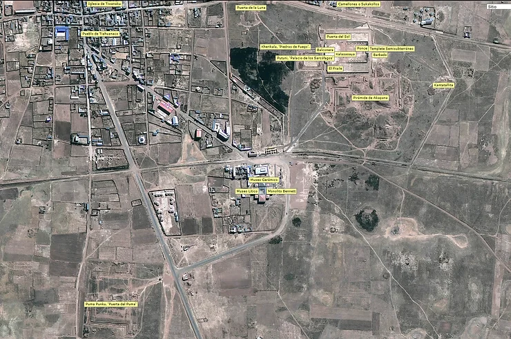 Ci-dessous, plan plus large avec village actuel de Tiwanaku, Puma Punku et l'emplacement des musées.
