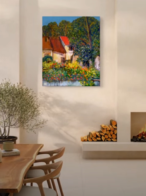 Devant elle, un déferlement de fleurs embrase les couleurs, éclats de soleil répandus dans l’ombre des grands arbres. Le vert profond des feuillages encadre cette scène simple et lumineuse, où l’eau, en bas, reflète les murmures du temps. Tout semble immobile, et pourtant la vie bruisse partout — dans la lumière, dans les pétales, dans le souffle du vent.