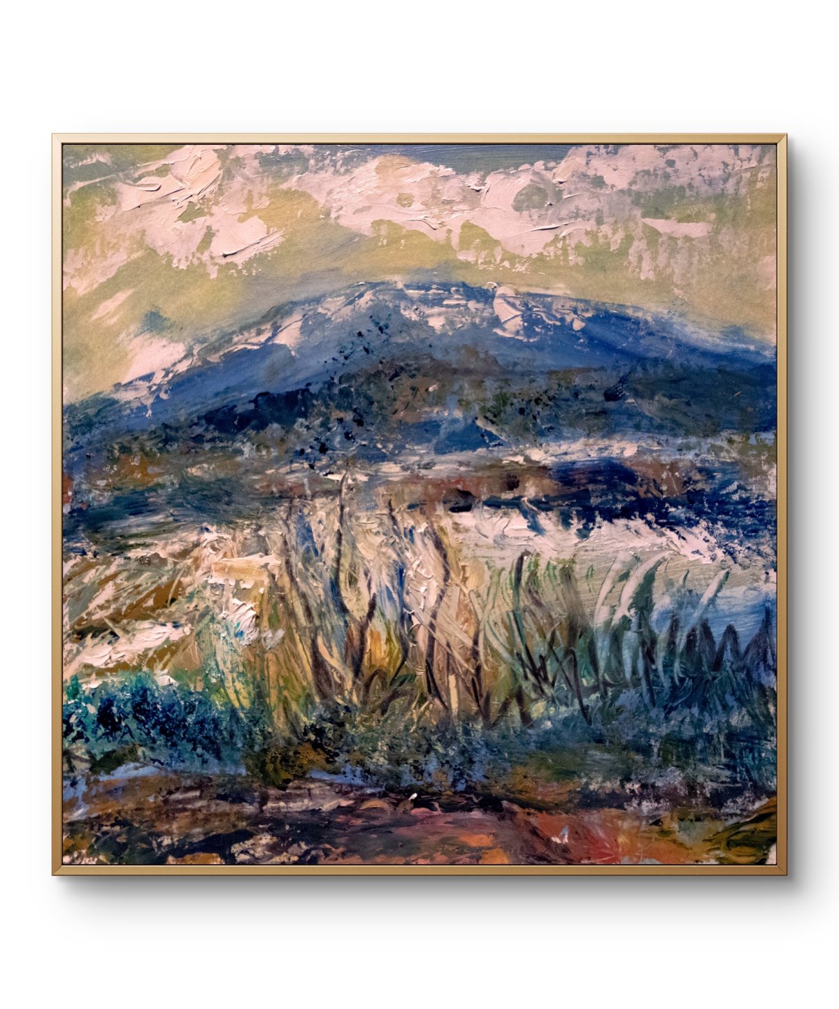 Au premier plan, les folles herbes montent en élans désordonnés, griffant l’air, vibrantes d’une vie rude et silencieuse, tandis que la terre sombre conserve la chaleur des jours passés.