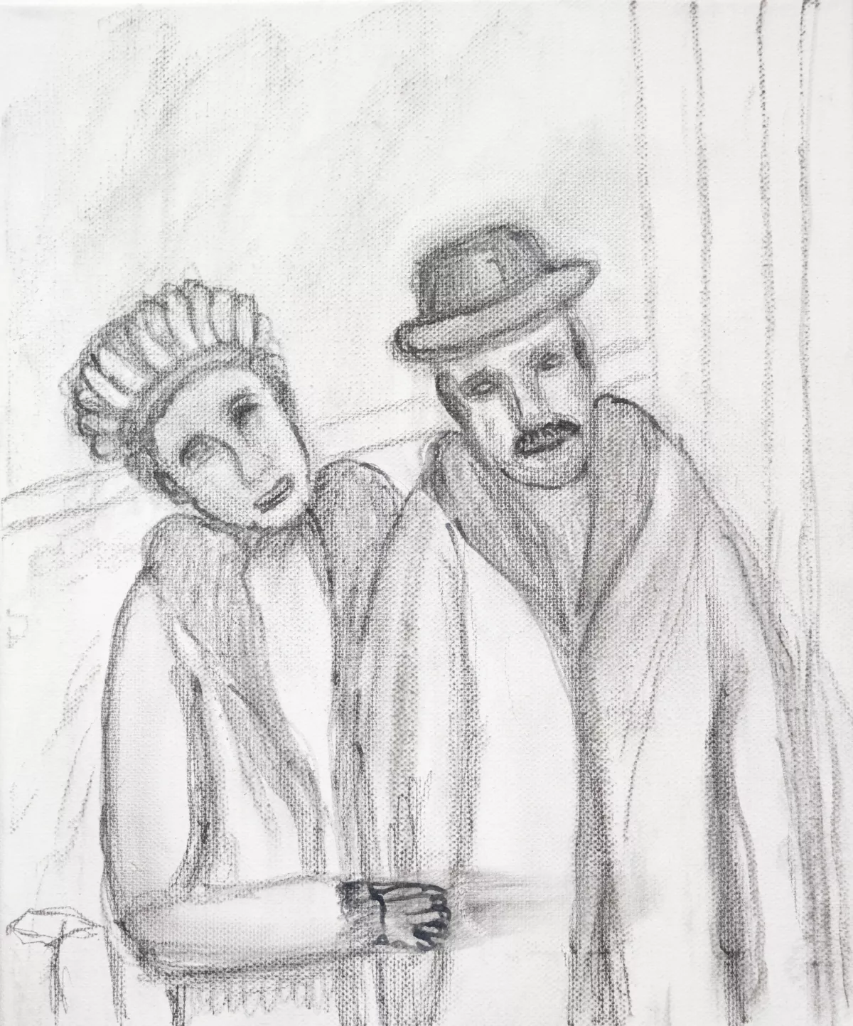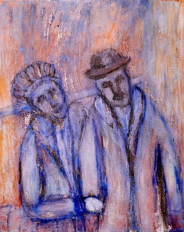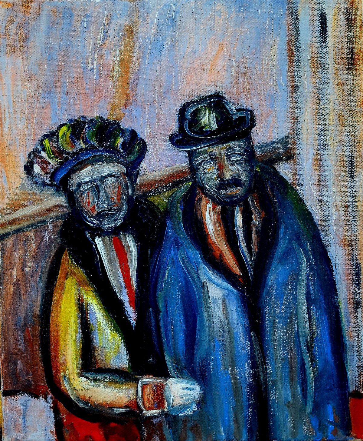 Je profite d'une toile de moindre qualité pour m'éclater dans un mode expressionniste. Être ou paraître ? Les gens avancent dans la vie en portant des masques. Ils en changent suivant la pièce qu'ils doivent jouer.