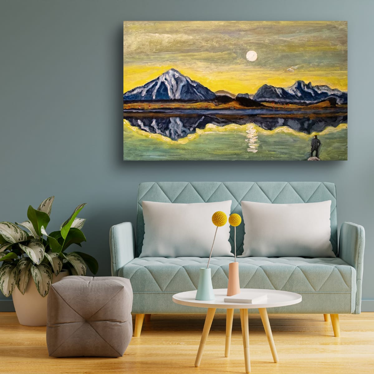 La toile déploie une vision de quiétude grandiose : un ciel adouci par l’or du crépuscule, où le soleil rond s’élève comme une perle suspendue.