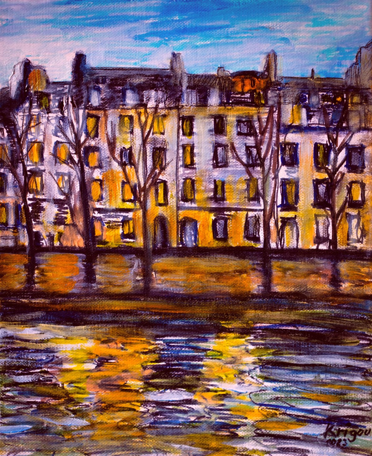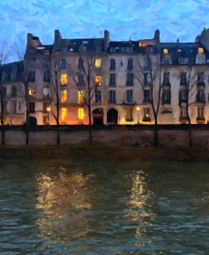 Le bord de la Seine à la nuit tombante est un lieu magnifique. Les quais sont bordés de maisons haussmanniennes construites au XIXe siècle, aux façades élégantes et aux fenêtres éclairées. En bas, la Seine coule doucement, ses eaux scintillent à la lumière des lampadaires, l'air est frais et le ciel est souvent parsemé d'étoiles.