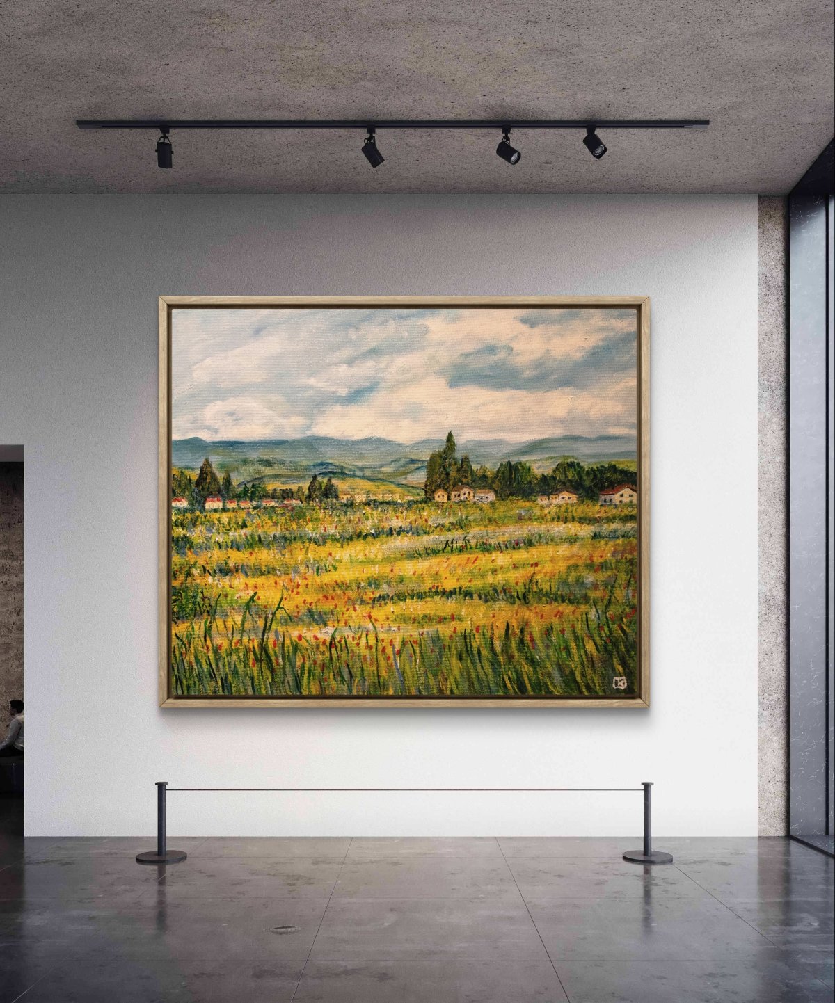Les couleurs sont chaudes, avec des nuances de vert, de gris et d'ocre jaune. Le ciel est bleu clair, parsemé de nuages blancs. C'est l'été et le son des cigales est audible dans l'air chaud. Des petits ruisseaux coulent dans les collines, alimentant les vergers et les jardins potagers des fermes. Des fleurs sauvages poussent en désordre sur le bord des chemins, dans les champs. Tout respire la tranquillité...