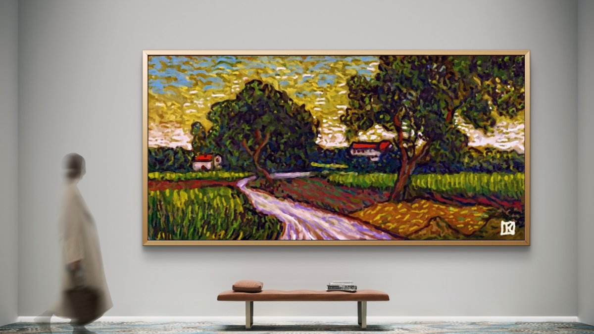 Les maisons aux toits rouges reposent comme des secrets bien gardés, blotties dans les bras verts de la campagne. Le ciel, éclaté de jaune et d’azur, palpite d’une énergie presque irréelle, comme si la vie elle-même dansait à chaque touche de pinceau.