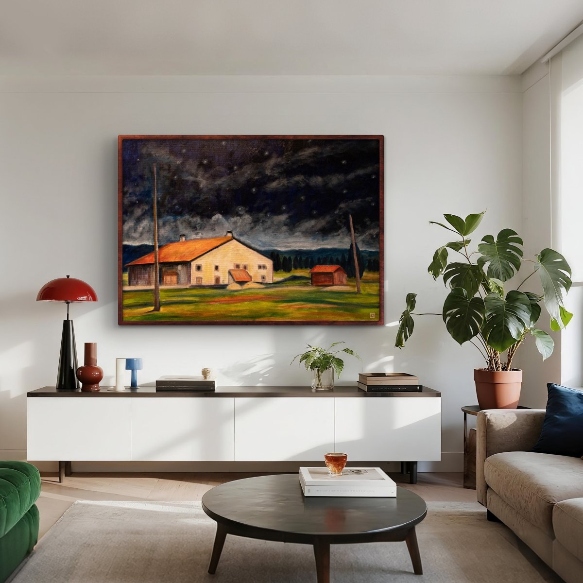 Sous un ciel de velours noir, piqué d’étoiles tremblantes, la ferme sommeille dans une clarté irréelle.