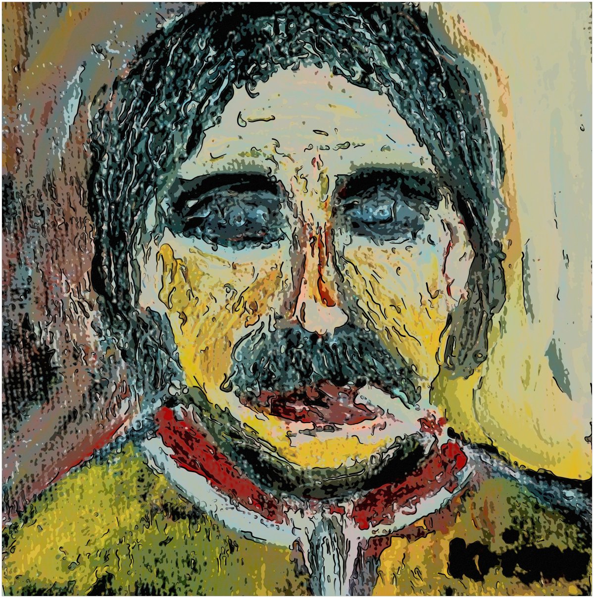 Les yeux sombres, presque noyés, fixent sans regarder, comme absorbés dans une fatigue ancienne. La moustache et la cigarette ajoutent à la figure une aura de révolte désabusée, entre lucidité et abandon. La matière, posée en reliefs épais, donne à la chair une intensité brute, presque douloureuse.