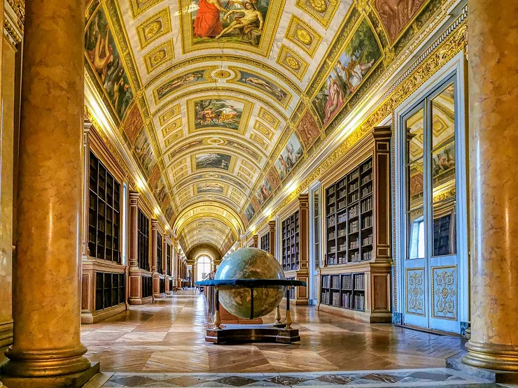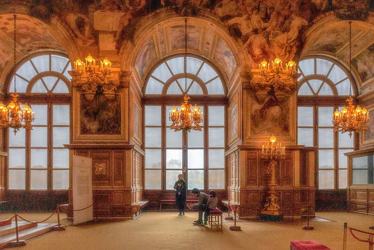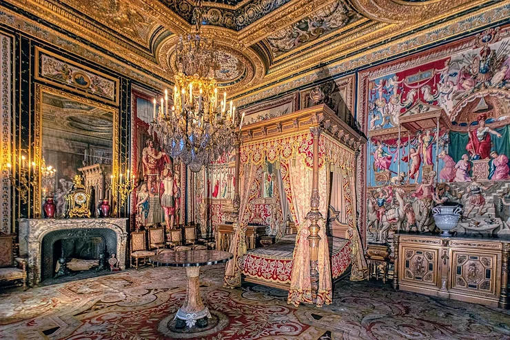 Plus loin, on croise l’immense galerie de Diane, transformée en bibliothèque sous Napoléon III, avant de pénétrer dans la fastueuse chambre de l’Impératrice, occupée par toutes les souveraines, de Marie de Médicis à l’Impératrice Eugénie. Le merveilleux lit surmonté d’un « amour » qui pose un doigt sur ses lèvres était destiné à Marie-Antoinette, mais c’est Joséphine, l’épouse de Napoléon Ier, qui l’occupera. À partir de sa chambre, la Reine ou l’Impératrice pouvait rejoindre ses appartements privés, plus intimes et loin des contraintes de l’étiquette. Le boudoir d’Argent, créé pour Marie-Antoinette, témoigne de l’extrême raffinement de leur décor.