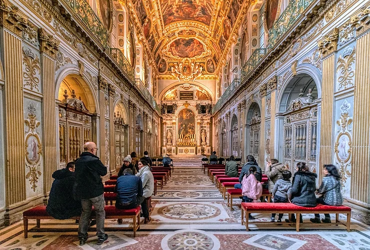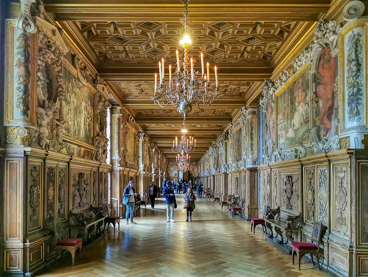 Pour relier la chapelle à ses appartements, François Ier fit construire une spectaculaire galerie où les lambris, les stucs et les fresques des Italiens Rosso et Primatice forment un décor qui marqua durablement la création artistique européenne sous le nom d’« école de Fontainebleau ». Un peu plus loin, entre cour et jardins, s’ouvre la salle de Bal, lieu de fêtes et de plaisirs esthétiques décoré par Nicolo dell’Abate à la demande d’Henri II et de Catherine de Médicis. En y invitant ces artistes italiens qu’ils affectionnaient tant, les rois mécènes ont fait du château de Fontainebleau un haut lieu de la Renaissance et de l’humanisme.