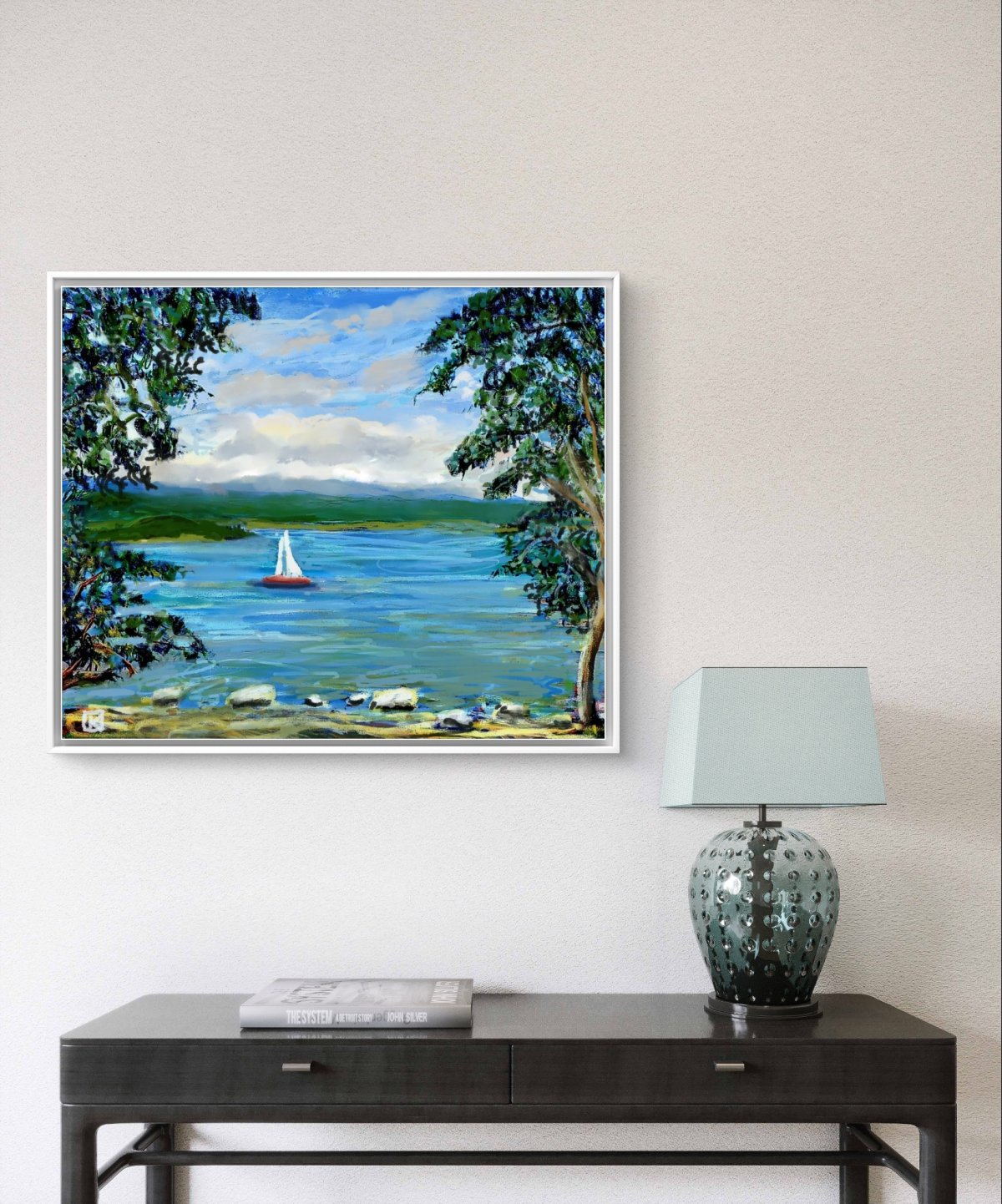 Les pierres au premier plan semblent garder le rivage, silencieuses sentinelles face au passage éphémère de l’embarcation. On respire ici la légèreté d’un été, un moment suspendu où le vent se marie à l’eau.