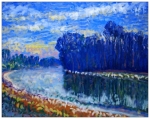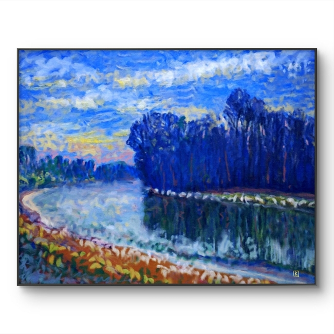 Le fleuve avance doucement, chargé d’ombres fraîches, mais il garde encore, sur son dos, quelques éclats du jour. Il est un miroir fragile, un souffle liquide, un long secret qui serpente entre les rives. Par endroits, l’eau semble s’effacer, devenir brume, comme si la nuit déjà tirait un voile sur elle.