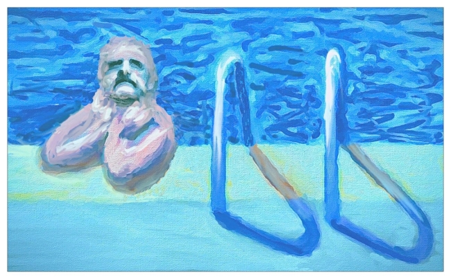 Au bord de la piscine, l’eau respire en larges écailles bleues, comme un ciel qui aurait décidé de flotter.