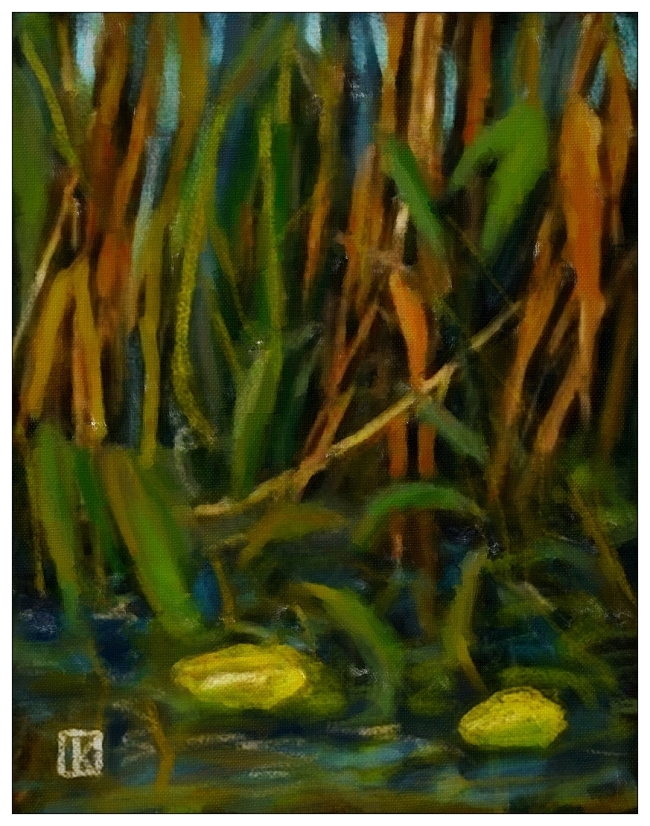 Dans cette mare silencieuse, le monde se resserre. Les tiges, dressées comme des prières, percent l’air tiède de la fin du jour.