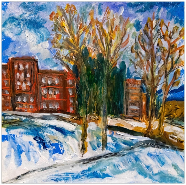 Tout le paysage semble avancer, emporté par un souffle de peinture où le gel et la mémoire se mêlent.