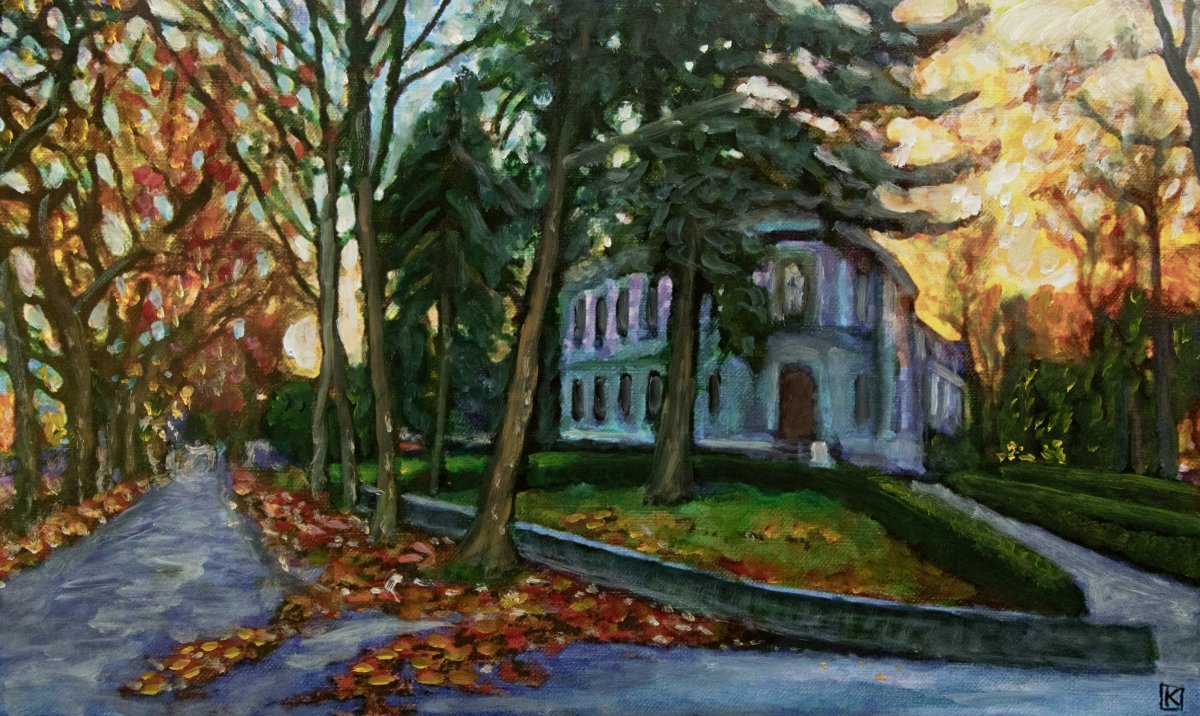 Les arbres, élancés comme des gardiens silencieux, laissent filtrer une lumière dorée qui incendie l’horizon, rappelant les derniers instants d’un jour mélancolique. À droite, le musée se dresse dans un halo bleu et vert, tel un sanctuaire du temps, observateur immobile des saisons qui le traversent.