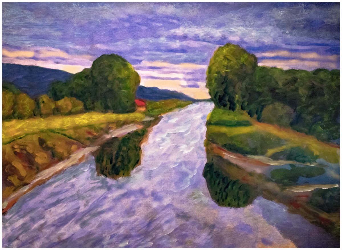 La rivière s’étire comme un ruban de soie lilas, capturant dans ses plis la lumière hésitante du lever du jour.