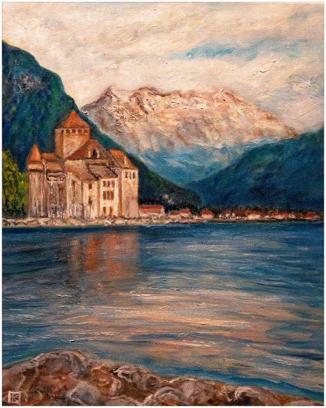 Le château se dresse, gardien de brumes et d’eaux profondes. Ses pierres, patinées d’histoire, reflètent l’or pâle du soir sur la surface tranquille du lac Léman.