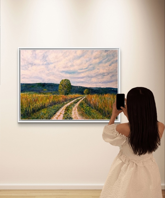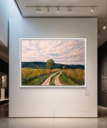 Deux arbres, comme des gardiens solitaires, ponctuent l’espace, veillant sur le voyageur invisible. À l’arrière-plan, la ligne sombre des montagnes du Jura ferme la perspective, tandis que le ciel vaste, traversé de nuages légers, respire l’immensité tranquille des jours d’été. C’est un paysage d’attente et de promesse, où chaque pas sur le chemin semble mener vers l’infini.