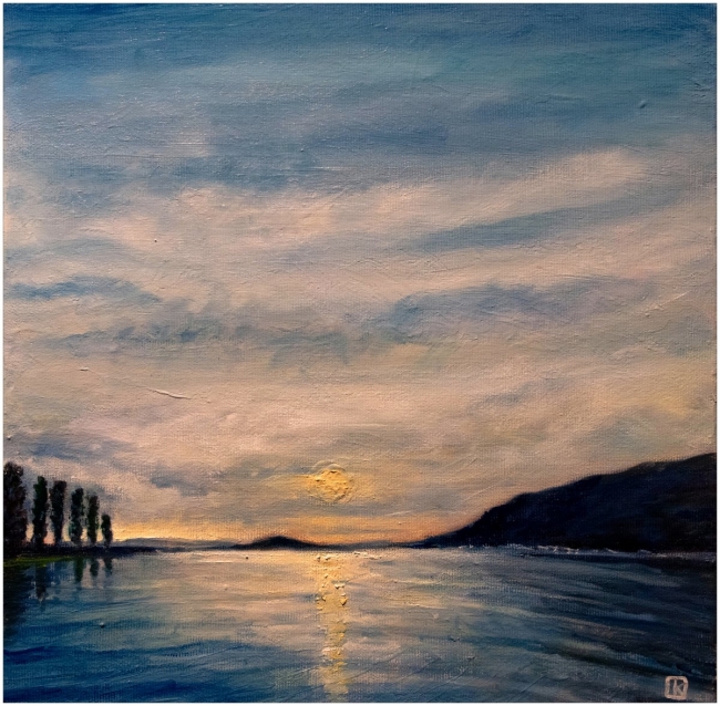 À gauche, les arbres veillent — alignés comme des sentinelles discrètes, tandis que la rive sombre à droite engloutit les dernières lueurs du jour.