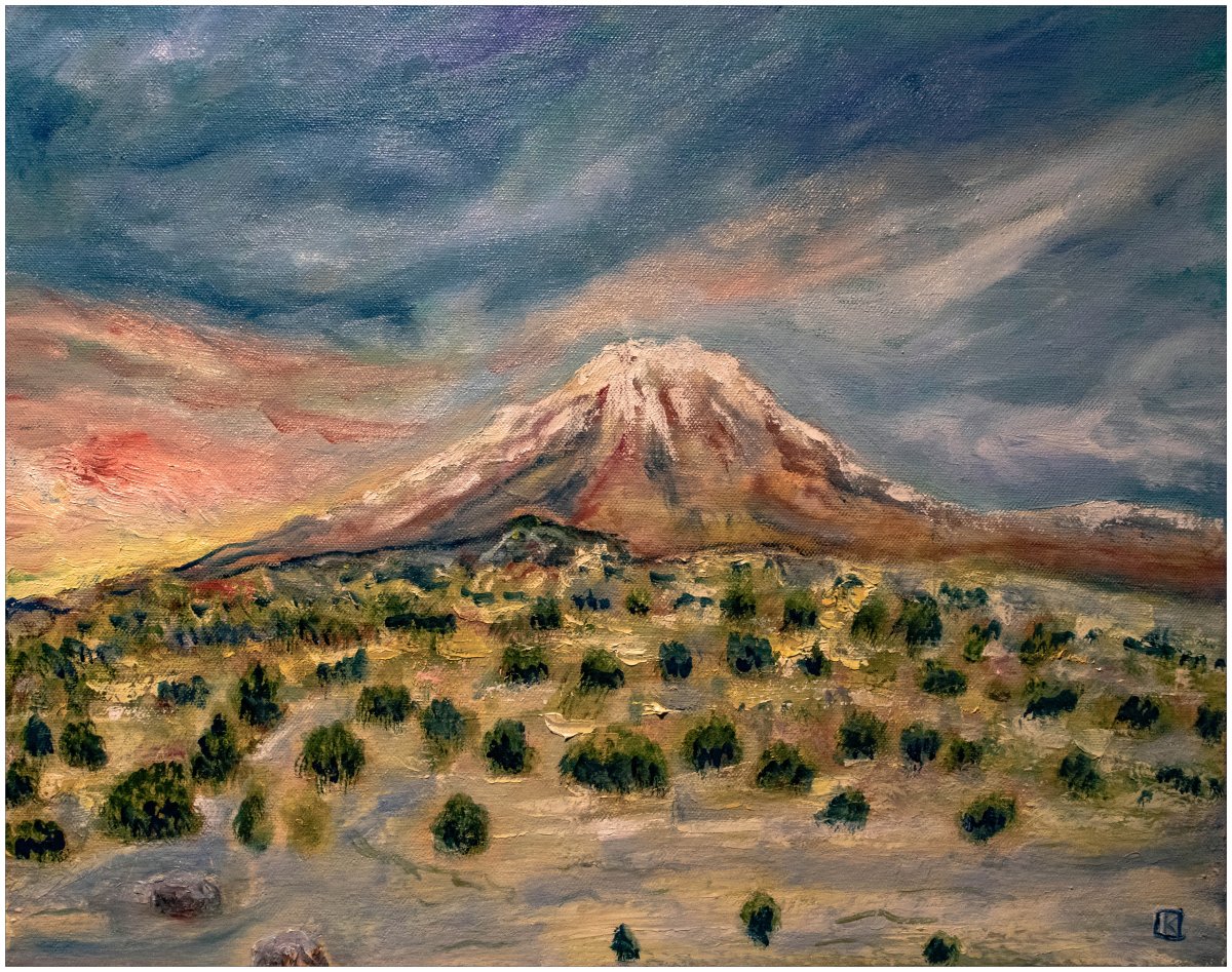 Sous la caresse du couchant, la montagne s’élève, solitaire et vaste, couronnée de neige et de cendres.