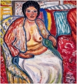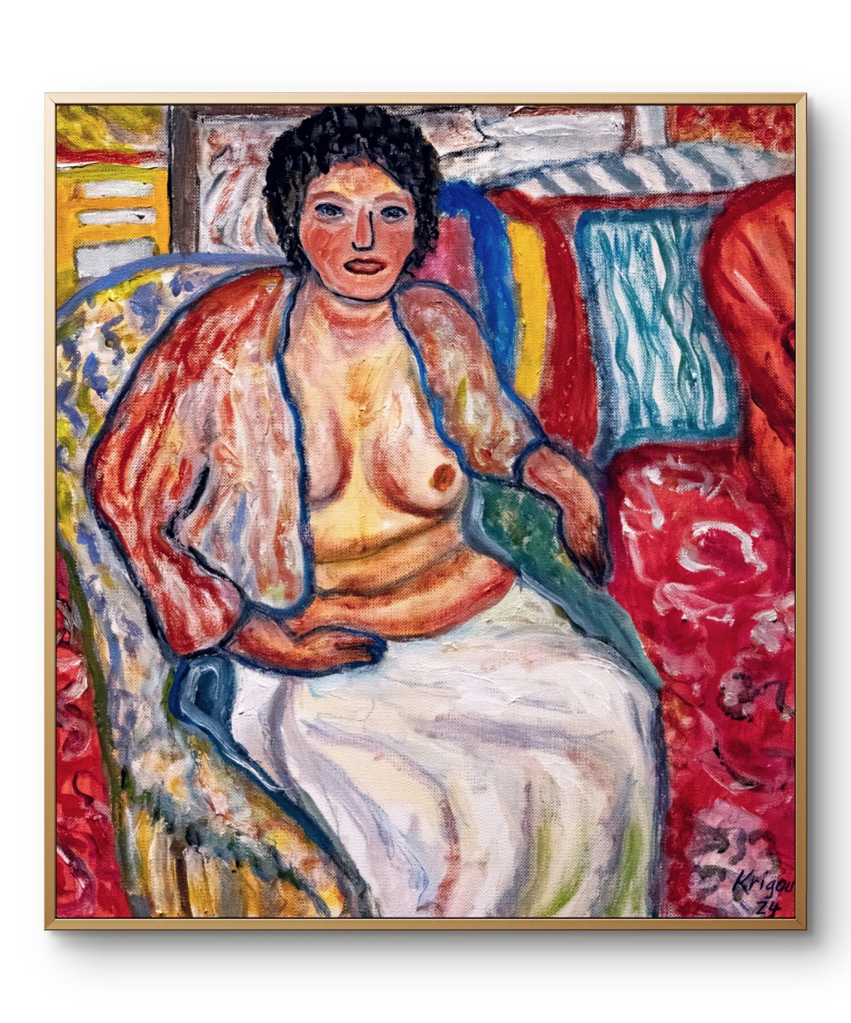 Dans cette peinture vibrante, une femme repose comme une île tranquille au cœur d’un torrent de couleurs. Son corps, peint avec une franchise douce, semble respirer au rythme des rouges, des bleus et des ors qui l’entourent.