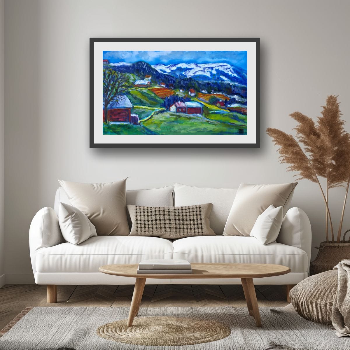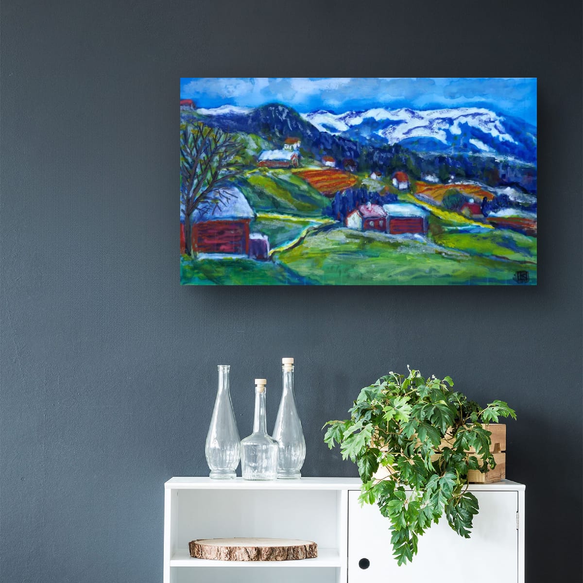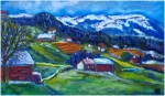 Dans la vallée, les champs s’embrasent de rouges et de verts, comme une terre qui se réveille en couleurs.