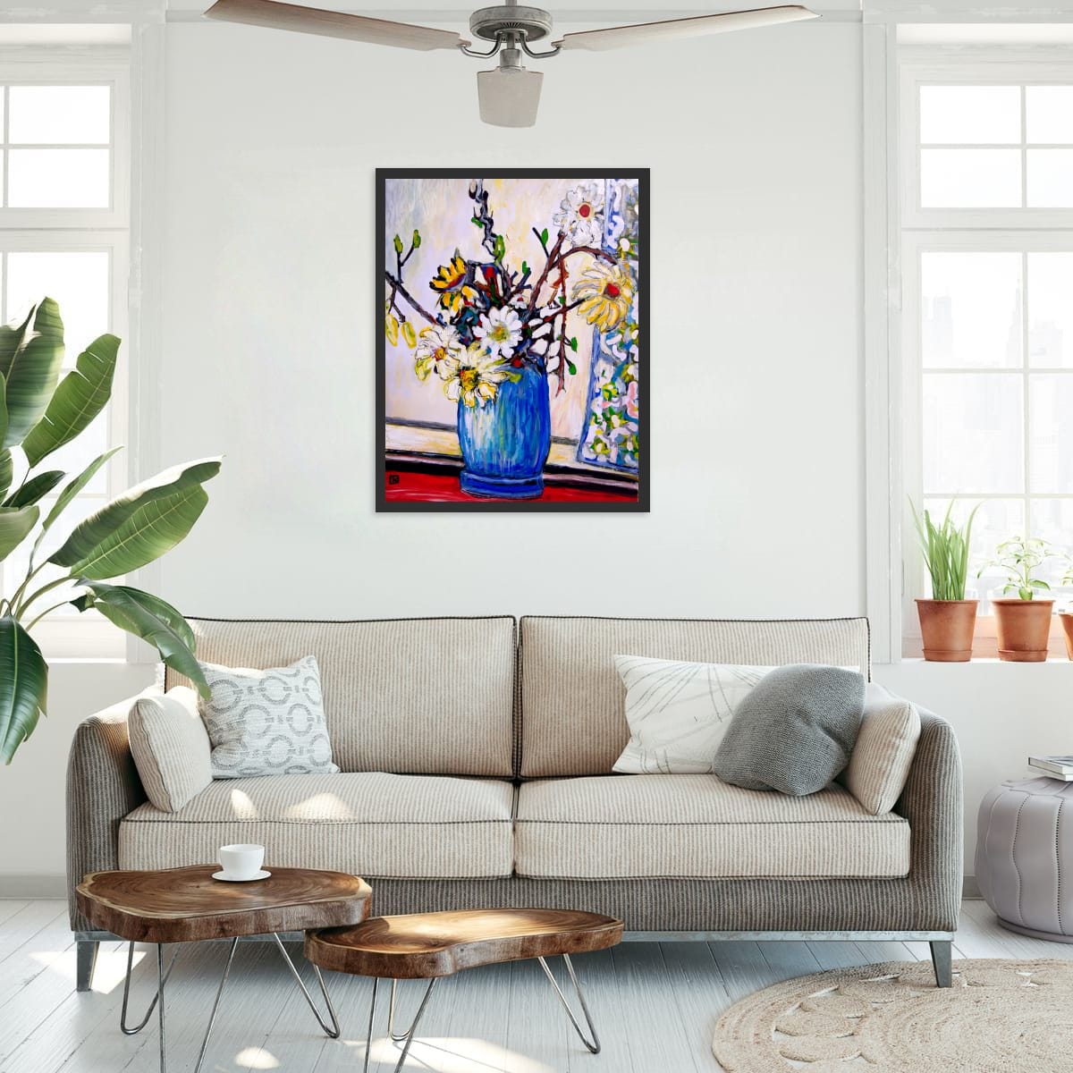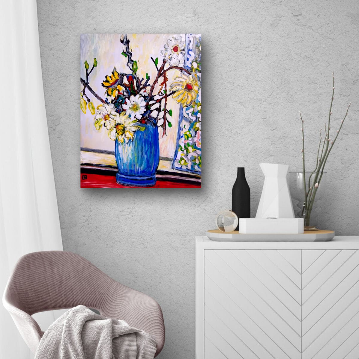Les marguerites éclatent en soleils blancs et jaunes, mêlées aux branches encore hésitantes de la saison. La fenêtre derrière elles laisse couler une lumière douce qui caresse les pétales et fait danser les couleurs.