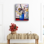 Dans le vase bleu profond, les fleurs se rassemblent comme une petite fête de printemps.