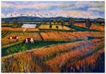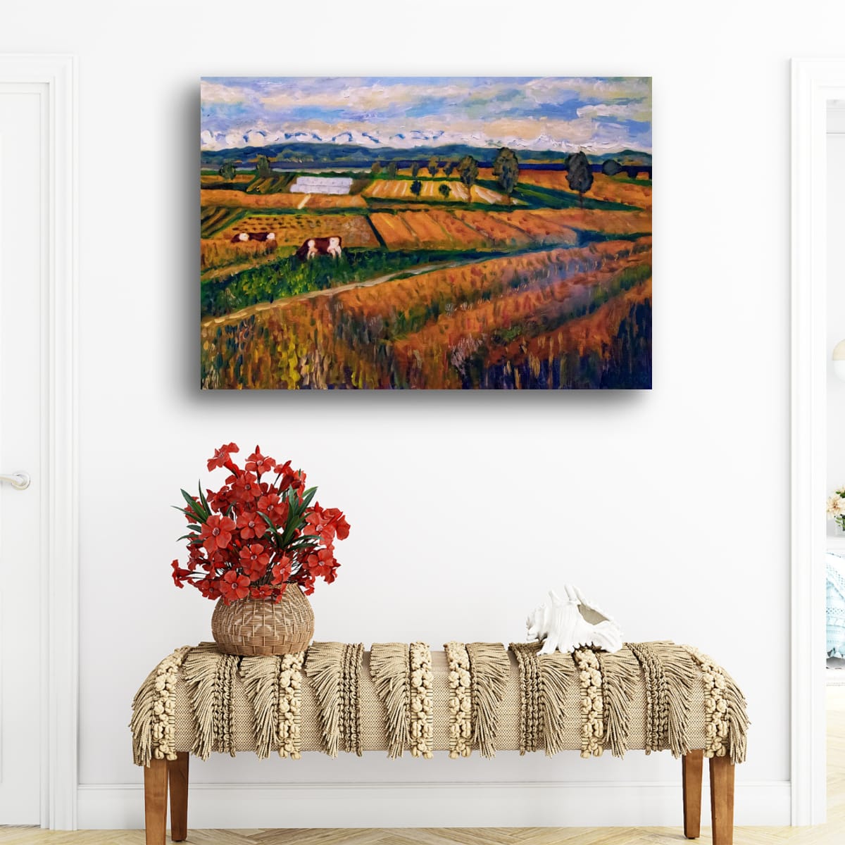 Prenez un moment pour respirer la tranquillité des terres du Seeland. Où le blé doré danse avec des taches émeraude, et où les vaches paissent sous un vaste ciel peint de nuages flottants. Chaque coup de pinceau tente de refléter la beauté infinie de la nature.