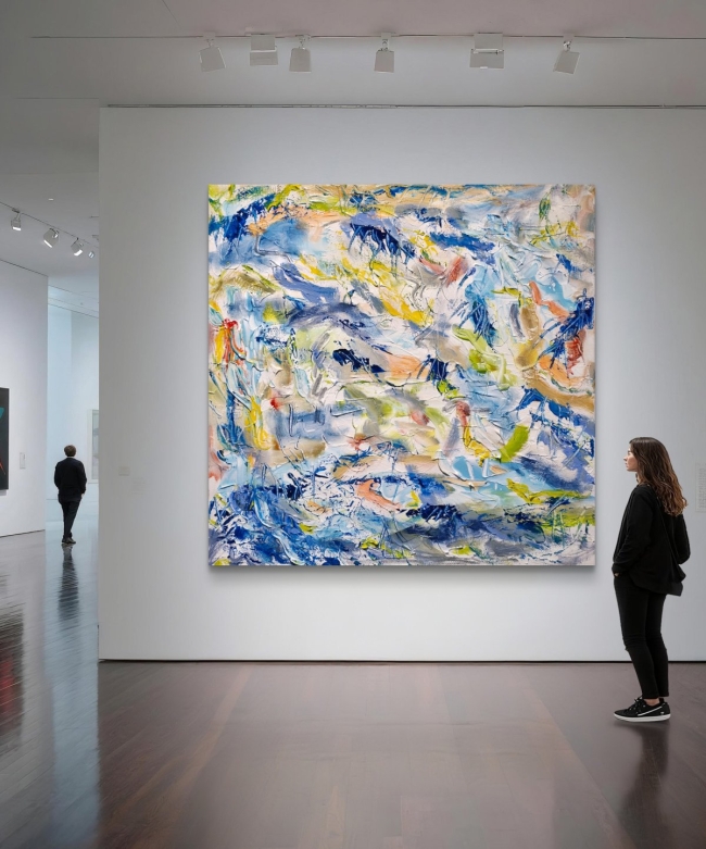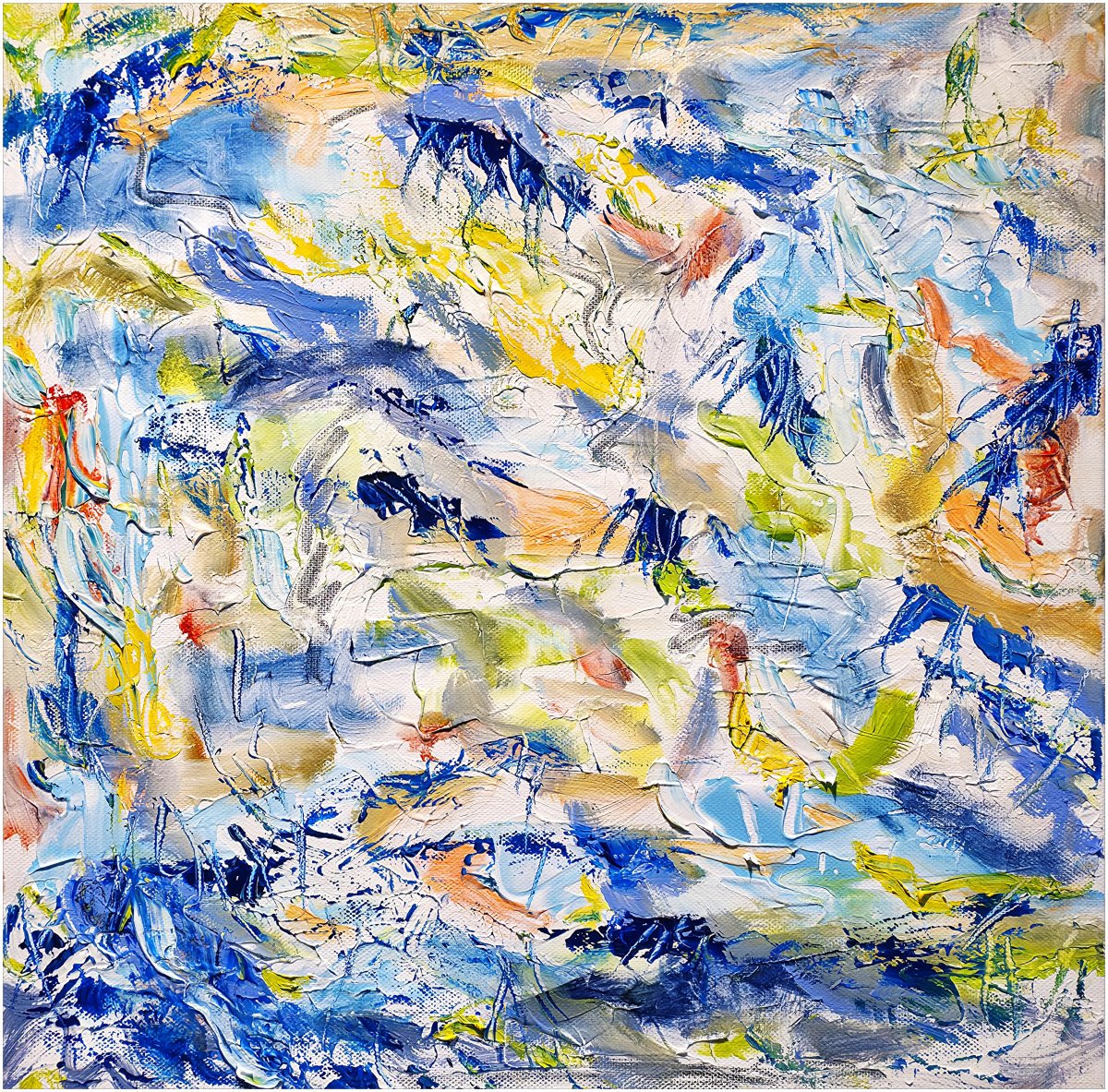 On y perçoit des mouvements de vagues, des vents contraires, des éclats de lumière — mais rien ne se fixe, tout se transforme. Les bleus profonds se dissipent en nuages laiteux, les jaunes s’embrasent comme des oiseaux de feu, et des touches vertes percent l’écume tel un printemps immergé.