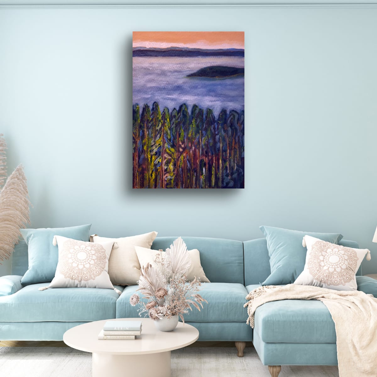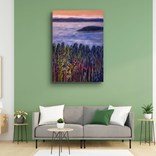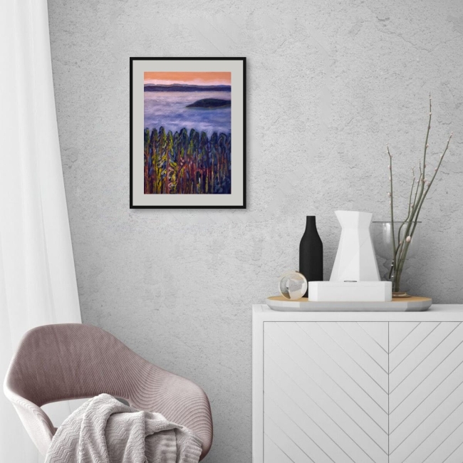 Le regard descend comme une barque lente. D’abord la ligne claire du ciel, jaune pâle, presque ancien, puis la morsure bleue des montagnes, posées là comme une pensée stable.