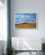 La colline respire, couverte d’herbes blondes et de sillons rouges, sous un ciel immense où glissent des nuages d’argent.