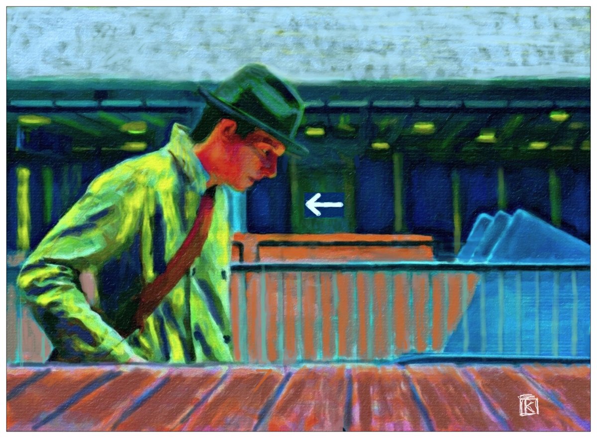 Son manteau capte la lumière acide du monde moderne, comme si chaque teinte — vert, bleu, rouge — lui rappelait une fuite ancienne. Derrière lui, une flèche blanche indique la direction contraire. Mais il ne la voit pas. Il va droit devant, vers rien, vers tout — vers l’ombre intérieure. Son visage est un silence, sa marche, une prière sans dieu.