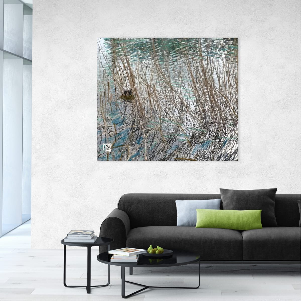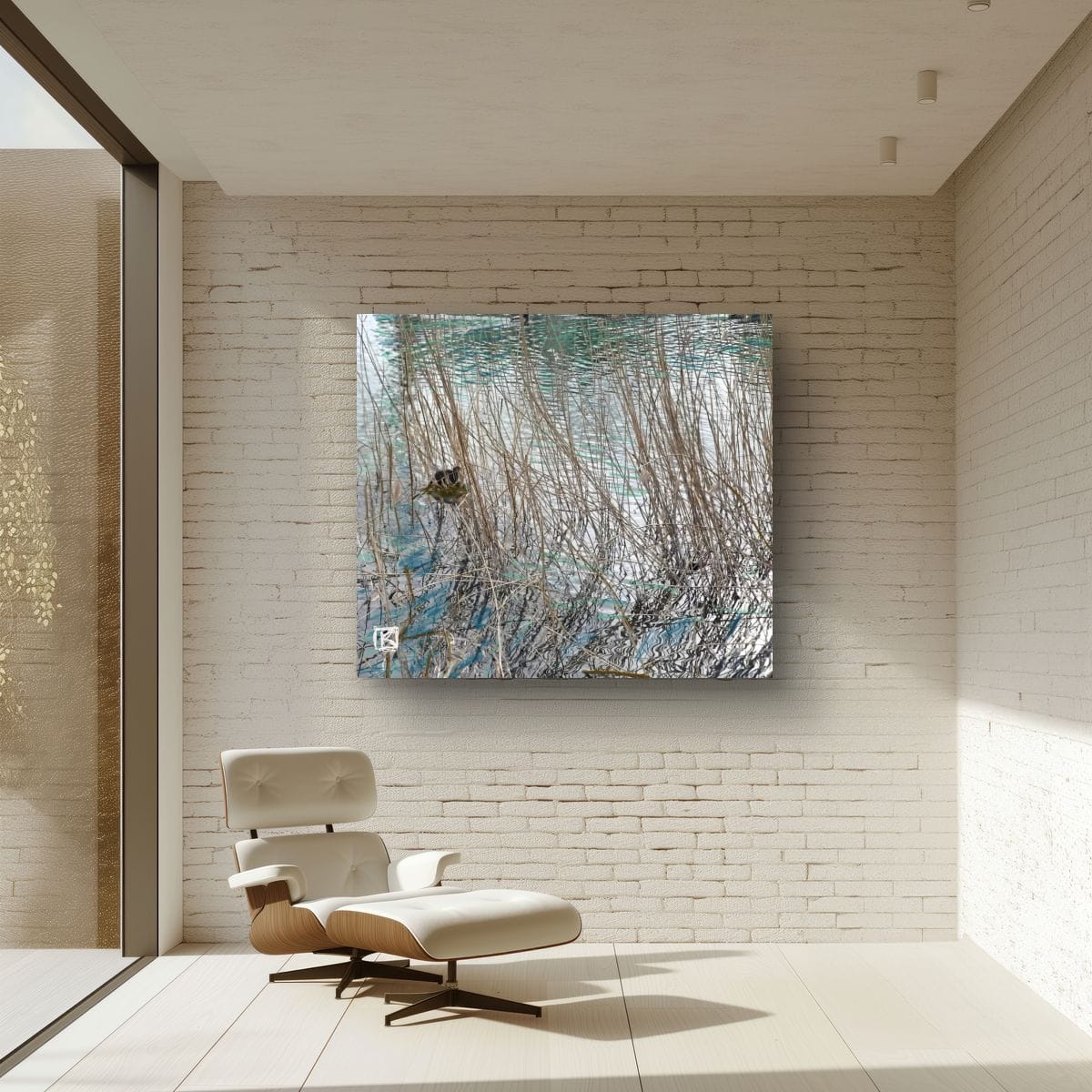Entre les tiges pâles des roseaux, l’eau miroite comme un parchemin frissonnant où le vent écrit des lignes turquoise.