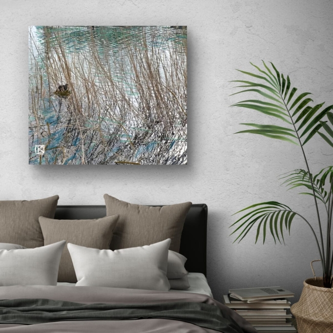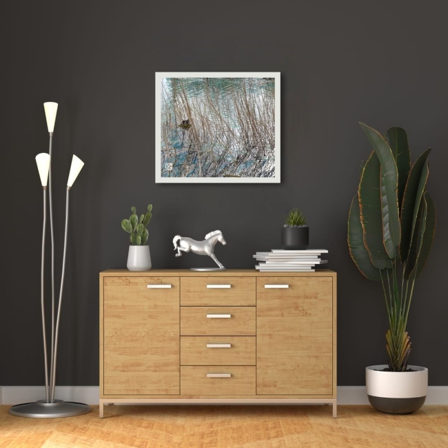 Au milieu de la danse des roseaux et des ondulations, une poule d'eau trouve refuge. Cet instant incarne la poésie de la nature : là où les eaux turquoise reflètent le ciel et où les tiges délicates tissent leur propre histoire. Cette peinture rend hommage à ces espaces paisibles où la beauté sauvage s'épanouit en toute sérénité.