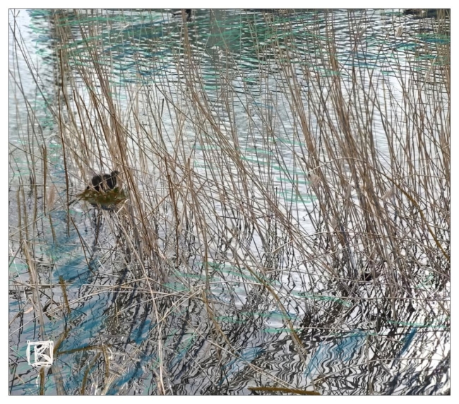 Les reflets tremblent, déformant le monde en calligraphies liquides qui dansent sous la lumière. Au cœur de ce labyrinthe fragile, une petite poule d’eau veille, sombre note posée sur la portée des joncs.