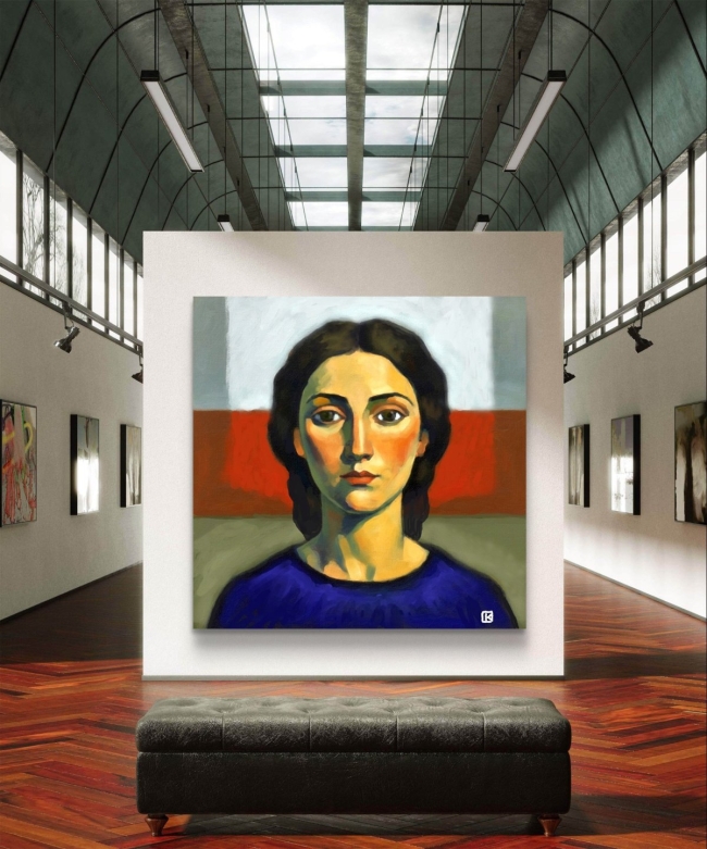 Le rouge derrière elle brûle sans flamme — sans doute le souvenir d’un amour perdu.