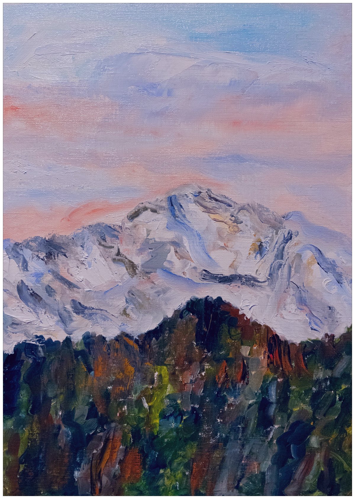 La cime pâle s’élève dans un souffle de rose, comme si le jour hésitait à partir. La forêt, dense et profonde, retient la lumière dans ses feuillages sombres.