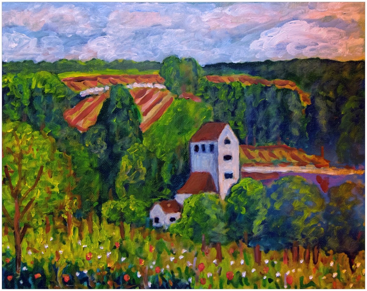 Sous un ciel froissé de bleu et de rose, la terre ondule comme un vieux drap de campagne, brodé de champs rouges et d’arbres profonds.