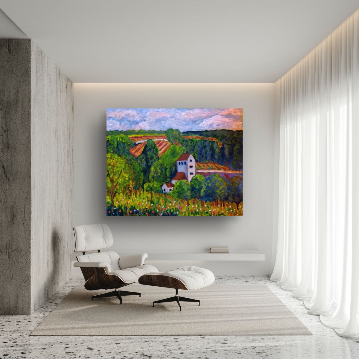 🌿 Au creux de cette mer verte, un cloître blanc se dresse, timide sentinelle aux toits de tuile chaude, comme s’il gardait le silence des collines. Les forêts épaisses l’enlacent doucement tandis que les sillons des cultures glissent au loin, rubans d’ocre posés sur la peau du paysage.
