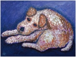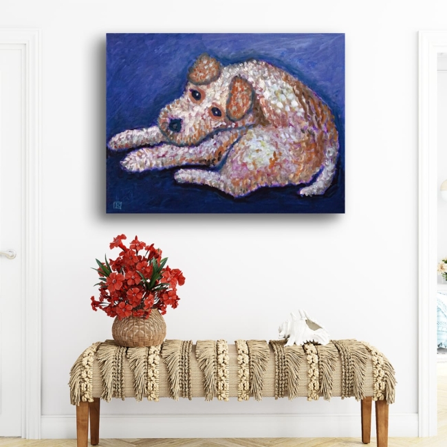 Dans la nuit bleu profond, un chien repose, bercé par les couleurs du monde. Sa fourrure, pétrie de rouges tièdes et d’ocres lumineux, respire doucement comme une braise qui refuse de s’éteindre.