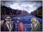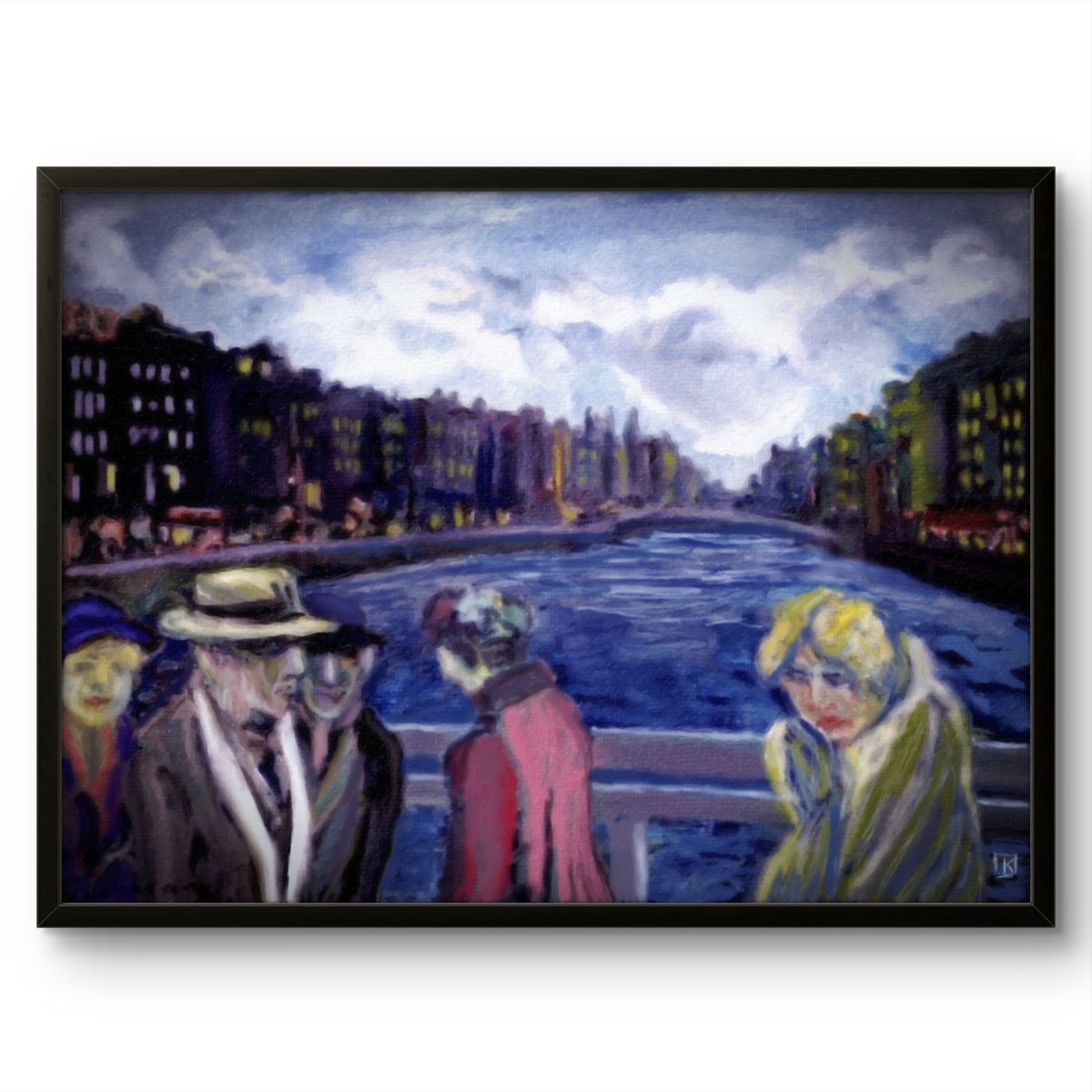 Le fleuve roule sous le ciel lourd, portant dans son bleu des fragments d’histoire et d’oubli. Sur le pont, les silhouettes glissent comme des ombres éveillées : chapeaux penchés, manteaux tirés, regards fuyants.